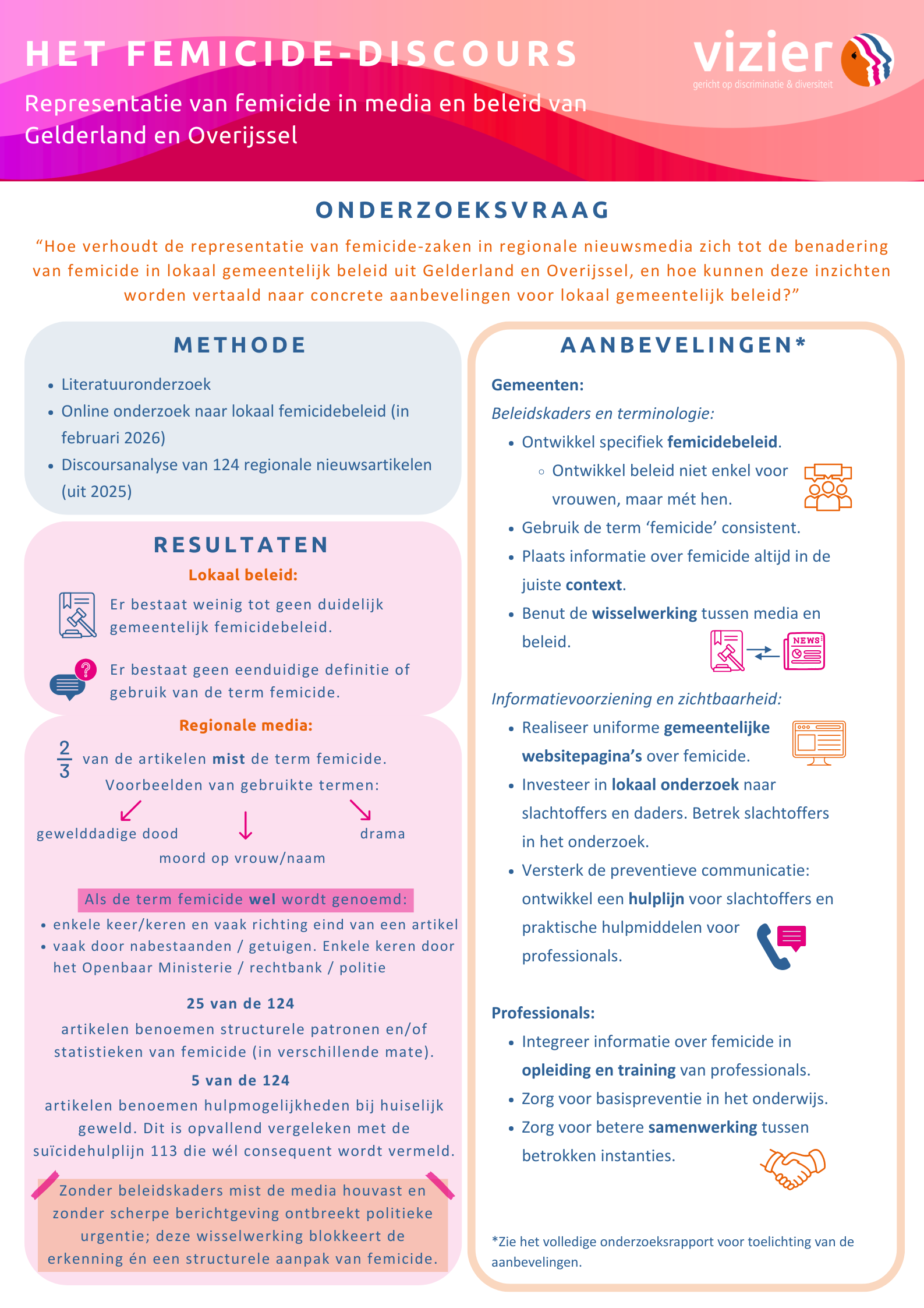 Vizier heeft daarom onderzoek laten uitvoeren naar de manier waarop femicide wordt besproken in regionale media en hoe het onderwerp terugkomt in lokaal beleid in Gelderland en Overijssel.